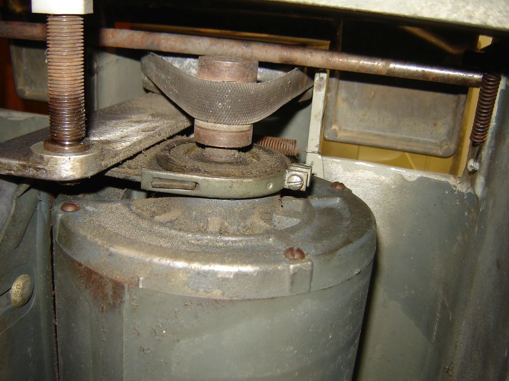 The grinder is comprised of three major cast aluminum assemblies: the power unit, the case, and the table (shown at right, click to enlarge). The power unit mounts in the case on two bearings, one bearing is seen at the bottom of the power unit. This bottom view shows the sparse internals. The 1740 RPM motor is stepped down about 5:1 by the pulleys to provide a wheel RPM of about 350. The wobbulator is a small eccentric wheel, seen peeking out of its support in the top of the case; the spindle shaft rides on and drives this wheel so its eccentricity causes the grinding wheel to shift side-to-side about once per second. Gravity plus a small spring (behind the motor) hold the spindle shaft against the wobbulator wheel.