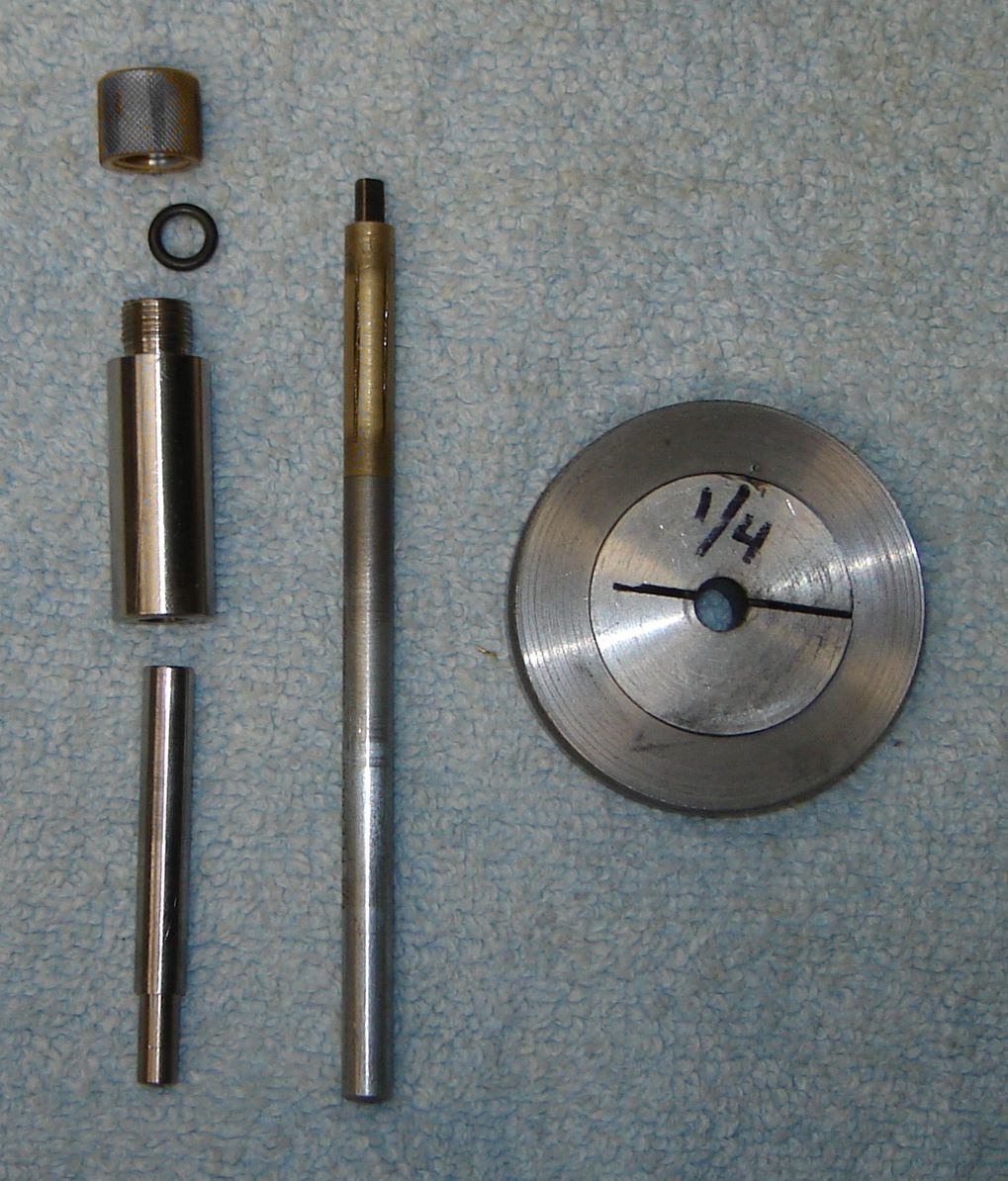 The body is a piece of rod from a discarded line printer, 1/2" by 1.75". This is drilled through with a "C" size drill then reamed to 0.250, followed by lapping to about 0.251. Lapping ensures the hole is round and the same diameter from end to end - verified by the feel of the lap as it traverses the length. One end of the body is turned down to 0.350 for a length of 0.275; this was threaded 32tpi (my default for many things).